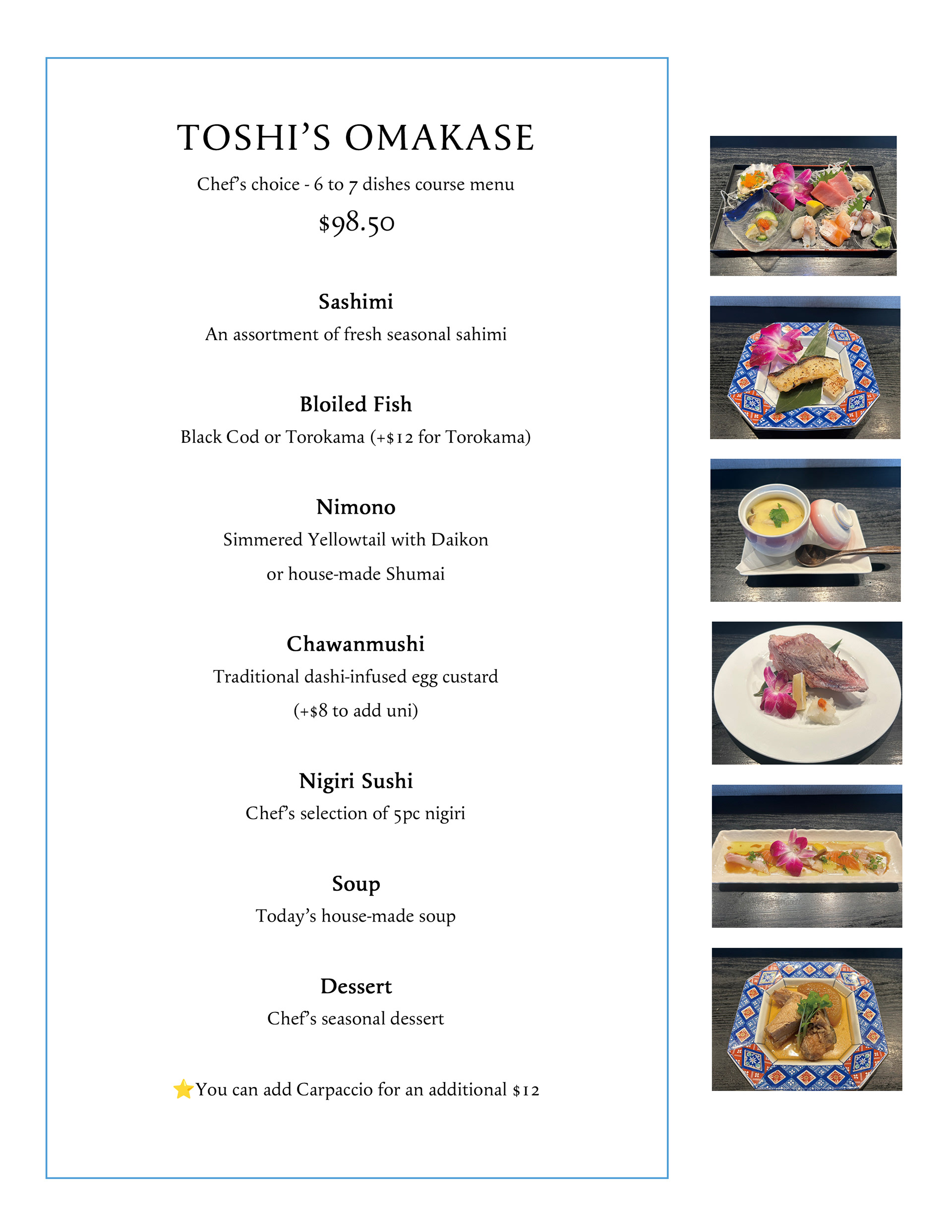(右)おまかせメニューを新しくしたいというご相談をいただきました。写真を添えてイメージしやすくしたいとのご希望だったため、実際にお店に伺って商品写真を撮影し、シンプルで分かりやすいメニューにデザインしました。
